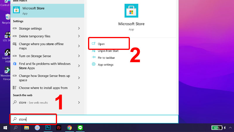 Bước 1: Gõ Store vào ô tìm kiếm > Nhấn Open để mở Microsoft Store.